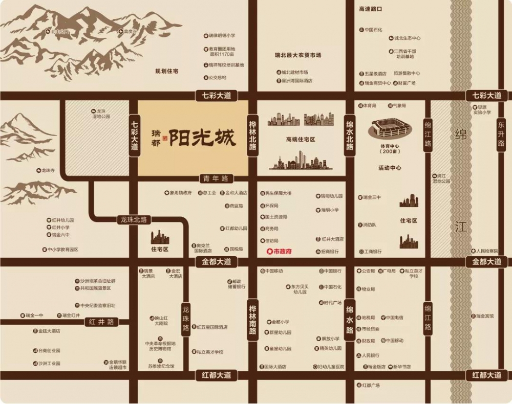 - 周邊設(shè)施:臨近體育中心,旅游集散中心,建材市場,五星級(jí)酒店,瑞金三中,瑞明小學(xué),龍珠湖公園等
