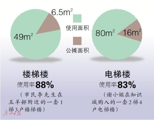 記者走訪廣州市場發(fā)現(xiàn),電梯樓的公攤面積普遍大于樓梯樓的公攤面積。根據(jù)合富研究院的相關(guān)數(shù)據(jù)顯示,廣州高層住宅電梯樓的正常使用率基本上都是在80%以上,其中80%到83%是主流,達到85%的都是比較優(yōu)秀的。相對而言,樓梯樓使用率會高一點,一般可以達到85%到90%。