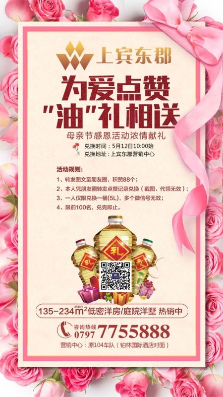 - 【上賓東郡】為愛點贊,“油”禮相送 5月12日即可兌5L食用油1桶