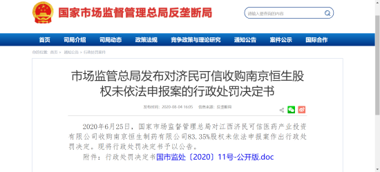 據(jù)國家市場監(jiān)督管理總局官方網(wǎng)站公開消息,近日,知名藥企江西濟(jì)民可信醫(yī)藥產(chǎn)業(yè)投資有限公司(以下簡稱濟(jì)民可信)因收購南京恒生制藥有限公司(以下簡稱南京恒生)83.35%股權(quán)涉嫌未依法申報違法實施經(jīng)營者集中,被國家市場監(jiān)督管理總局進(jìn)行立案調(diào)查。