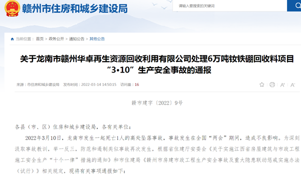 - 贛州龍南一企業(yè)處理釹鐵硼回收料項(xiàng)目發(fā)生事故 致1人高空墜亡