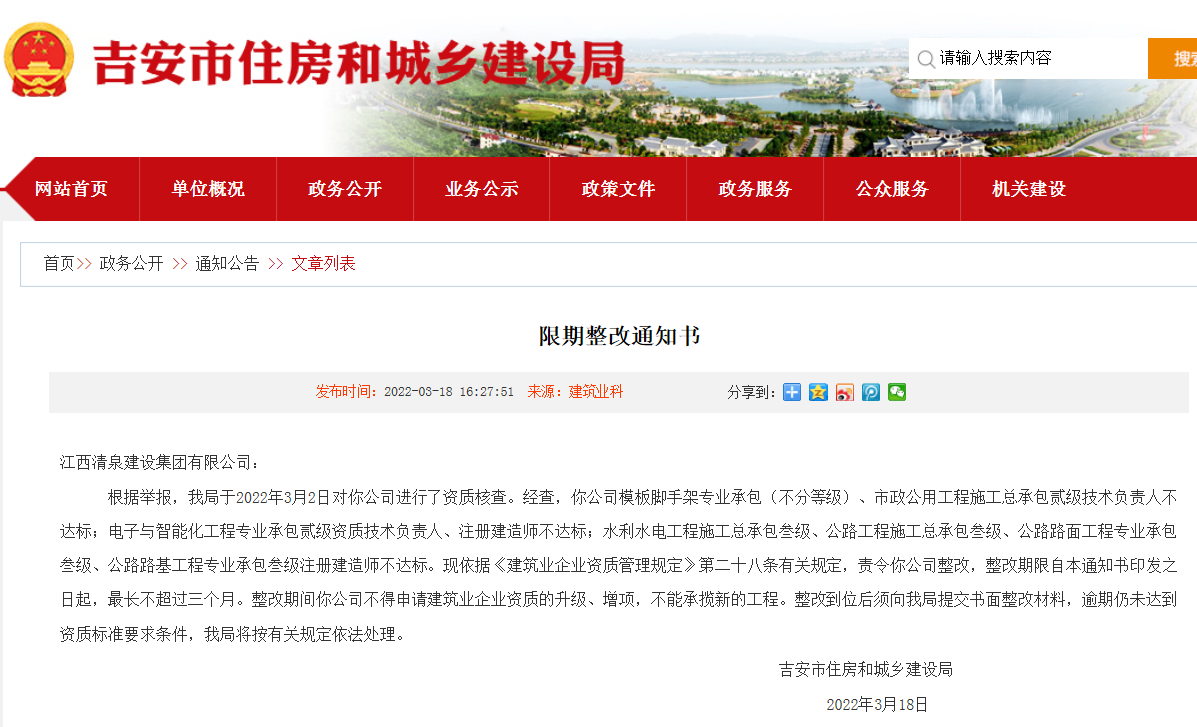 該“通知書”稱,根據(jù)舉報,吉安市住房和城鄉(xiāng)建設局于2022年3月2日,對江西清泉建設集團有限公司進行了資質核查。經查,該公司模板腳手架專業(yè)承包(不分等級)、市政公用工程施工總承包貳級技術負責人不達標;電子與智能化工程專業(yè)承包貳級資質技術負責人、注冊建造師不達標;水利水電工程施工總承包叁級、公路工程施工總承包叁級、公路路面工程專業(yè)承包叁級、公路路基工程專業(yè)承包叁級注冊建造師不達標。