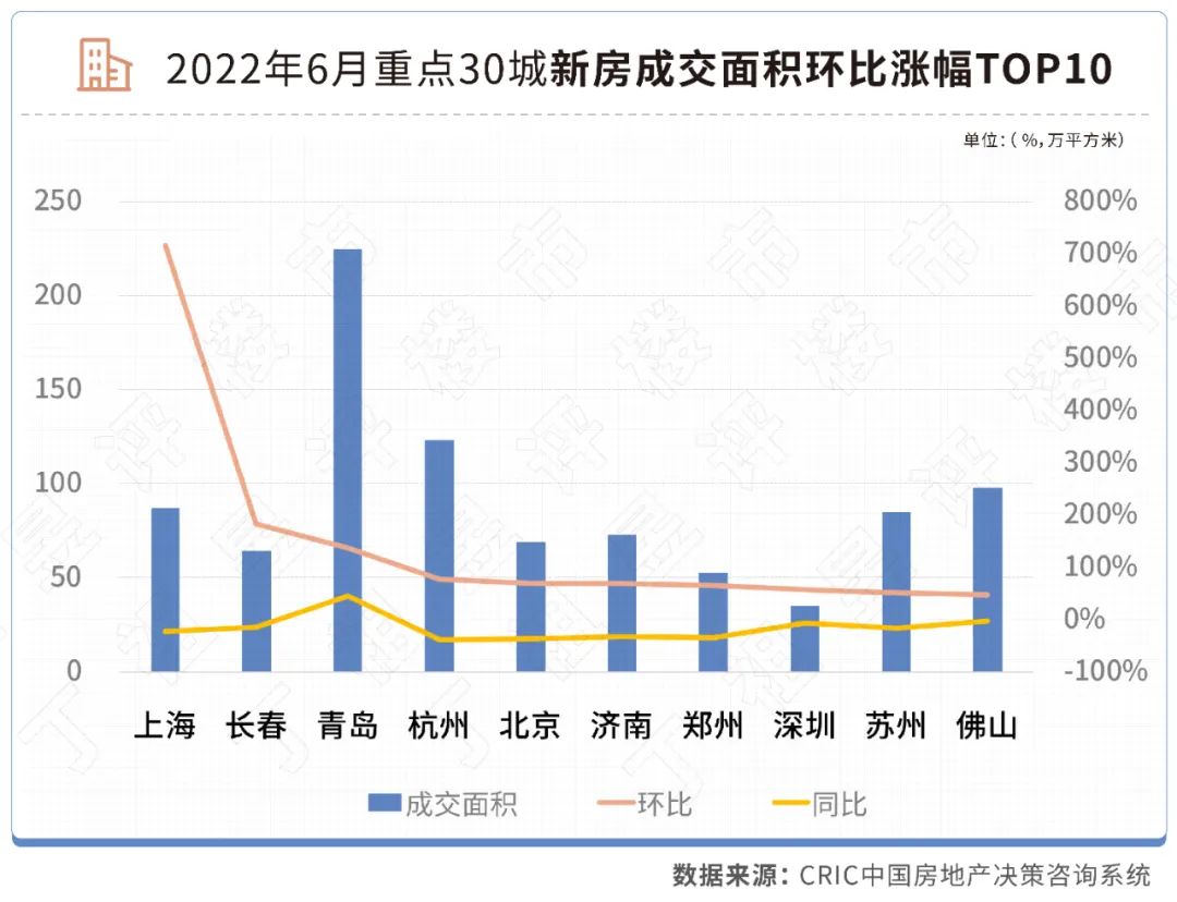 ??6月環(huán)比上漲幅度最大的是上海,成交面積為87萬平方米,環(huán)比增長716%,疫情之后補償性需求釋放。