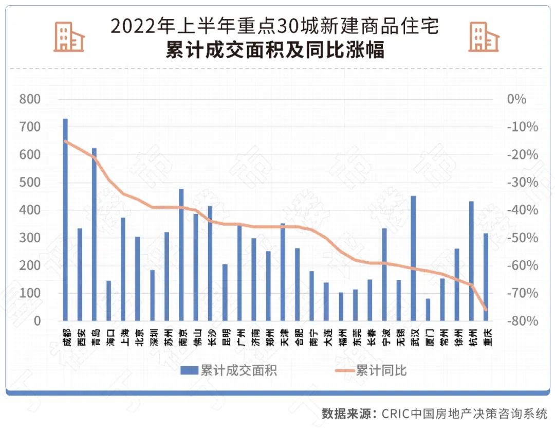 ??上半年累計數(shù)據(jù)更是差強人意。重點30城中,還沒有哪個城市出現(xiàn)正增長,僅成都上半年成交同比下降15%,排在30城首位。從降幅來看,仍有11個城市成交“腰斬”,這一比例達(dá)到近四成,其中,重慶上半年累計跌幅更是接近80%。