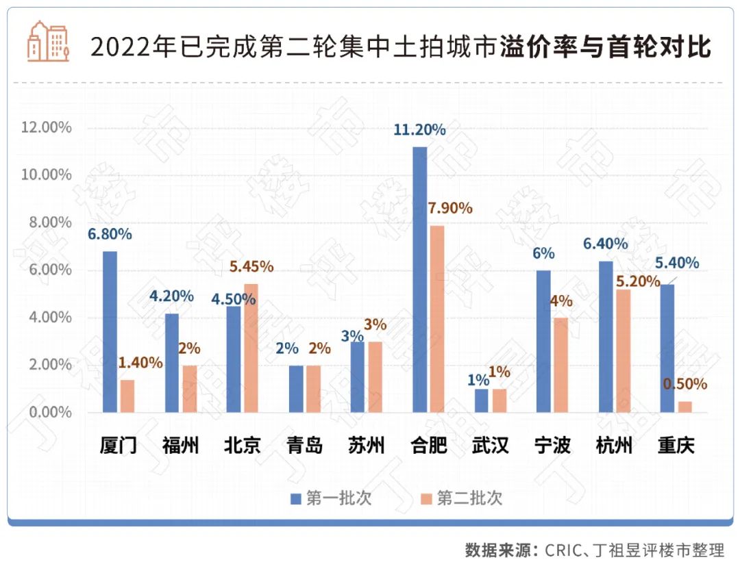 ??其中,廈門、福州、合肥、寧波、杭州和重慶6城溢價(jià)率較首輪均有不同程度下降,廈門降幅最大,較首輪溢價(jià)率降了5.4個(gè)百分點(diǎn),此外重慶溢價(jià)率也降了近5個(gè)百分點(diǎn)。