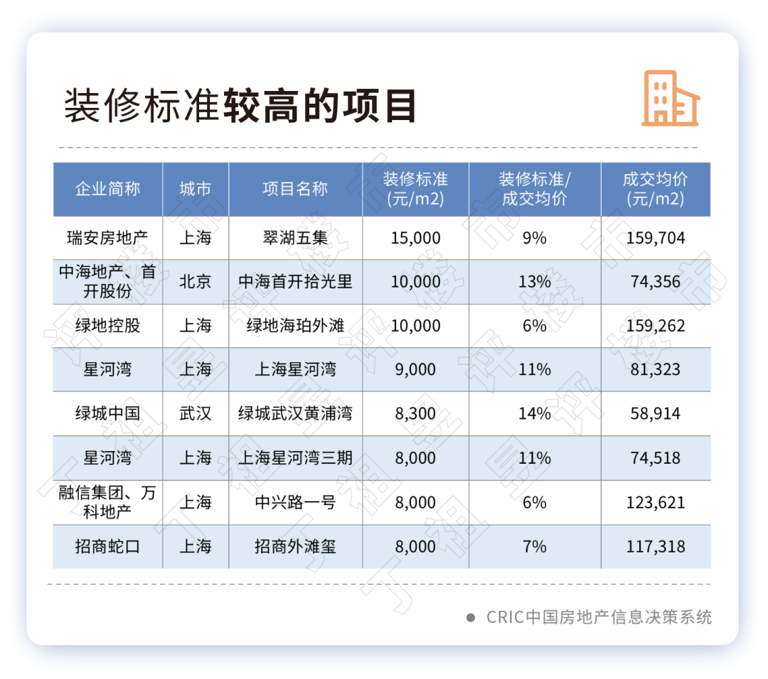 ??除此之外,還有不少裝修標(biāo)準(zhǔn)高于8000元/平方米的項(xiàng)目,如上海星河灣、綠城武漢黃浦、灣、上海星河灣三期、中興路一號(hào)、招商外灘璽等。