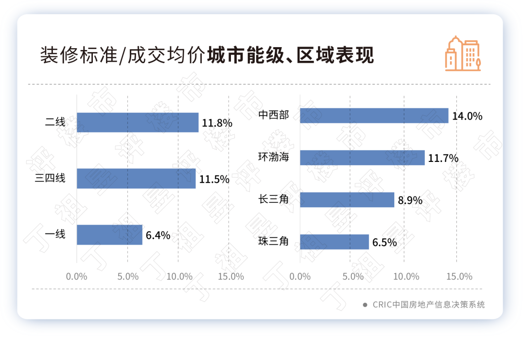 ??從區(qū)域表現(xiàn)來(lái)看,珠三角的裝修標(biāo)準(zhǔn)/成交均價(jià)為6.5%,裝修性價(jià)比較為良心。中西部區(qū)域裝修標(biāo)準(zhǔn)/成交均價(jià)比值達(dá)到14.0%,高于平均水平4各百分點(diǎn)。