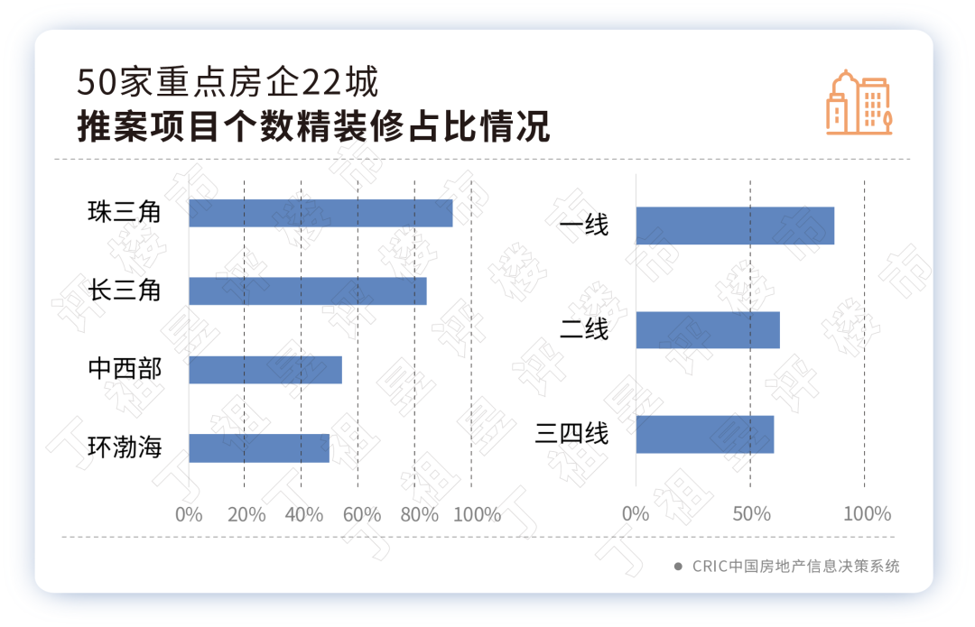 ??CRIC數(shù)據(jù)顯示,2021年1月-2022年6月期間,重點(diǎn)關(guān)注的50家房企在一線城市精裝修率達(dá)到了86%。