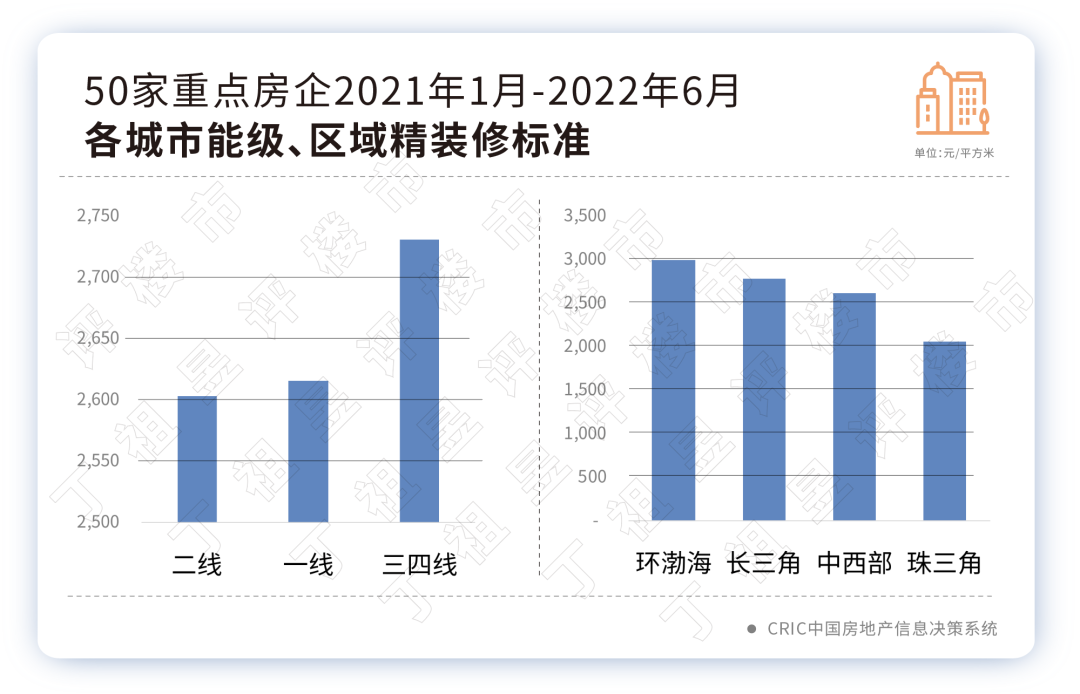 ??從裝修標(biāo)準(zhǔn)均值來(lái)看,2021年1月到2022年6月50家重點(diǎn)房企的精裝修項(xiàng)目平均值為2612元/平方米,環(huán)渤海區(qū)域以2989元/平方米的價(jià)格領(lǐng)銜,珠三角為2051元/平方米。